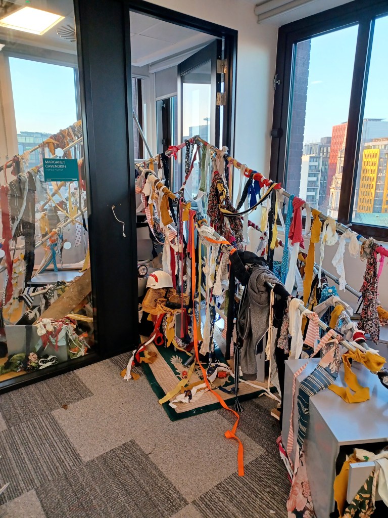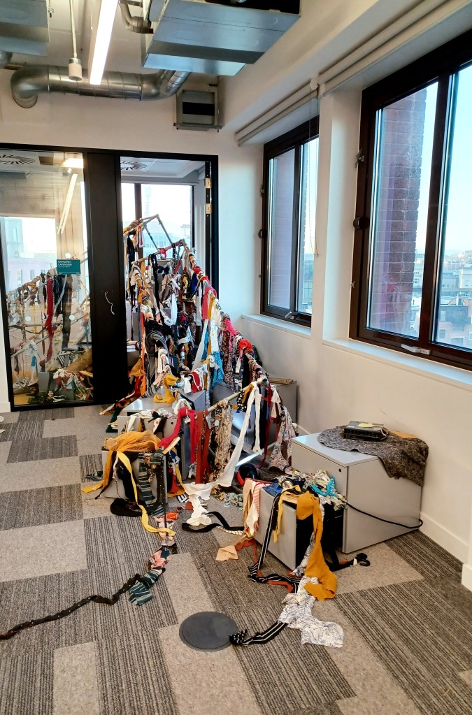 ‘pop-up shrine’, 2025. Materials: My dad’s floorboards, his car radios and broken flashlights, my siblings, girfriends and my clothes (scraps), my sisters suitcase (sorry I never gave this back), scaffolding, tarp, & my dad’s old carpet.